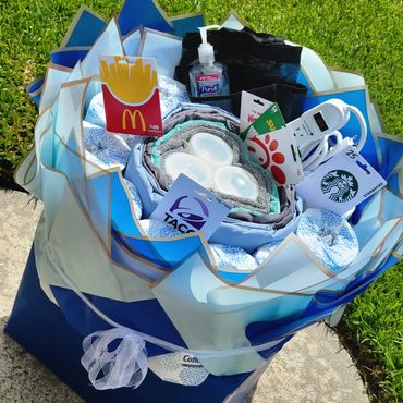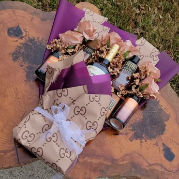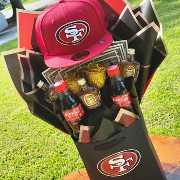 Snapback, mini bottles, soda, glitter roses, and custom gift bag (gifting amount not included in price)